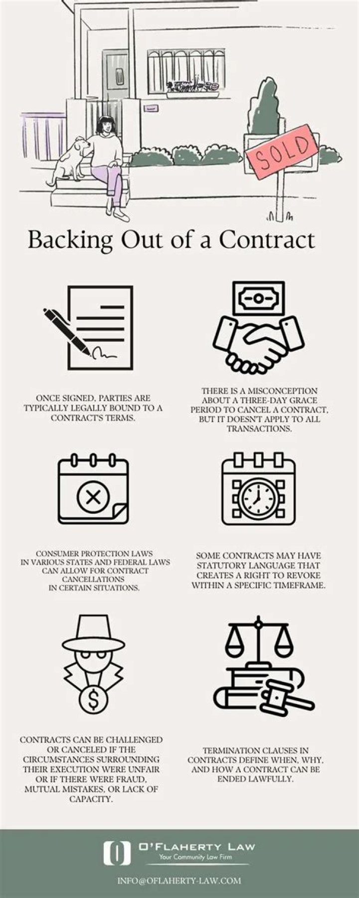 There is a federal law (and similar laws in every state) allowing consumers to cancel contracts made with a door-to-door salesperson within three days of signing. The three-day period is called a “cooling off” period.